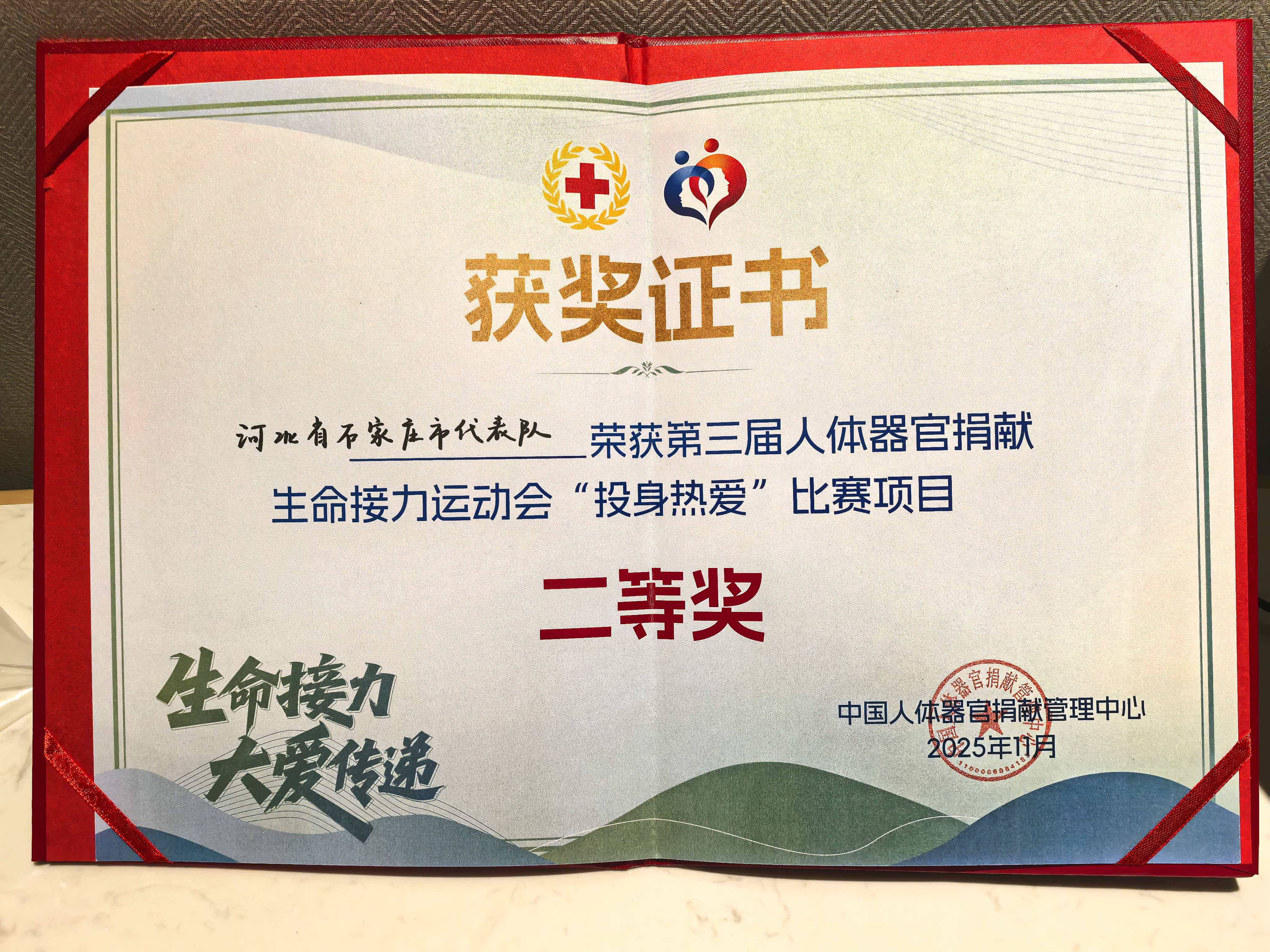 为深入贯彻落实《人体器官捐献和移植条例》和《关于促进人体器官捐献工作健康发展的意见》,开展好“生命教育+生命接力”行动,进一步弘扬“人道、博爱、奉献”的红十字精神,传播“自愿无偿、高效利他”的人体器官捐献理念,中国人体器官捐献管理中心在石家庄市举办第三届人体器官捐献生命接力运动会暨大爱传递文艺晚会。石家庄市红十字会作为协办单位积极参加此项活动,并荣获第三届人体器官捐献生命接力运动会“投身热爱”比赛项目单项二等奖。