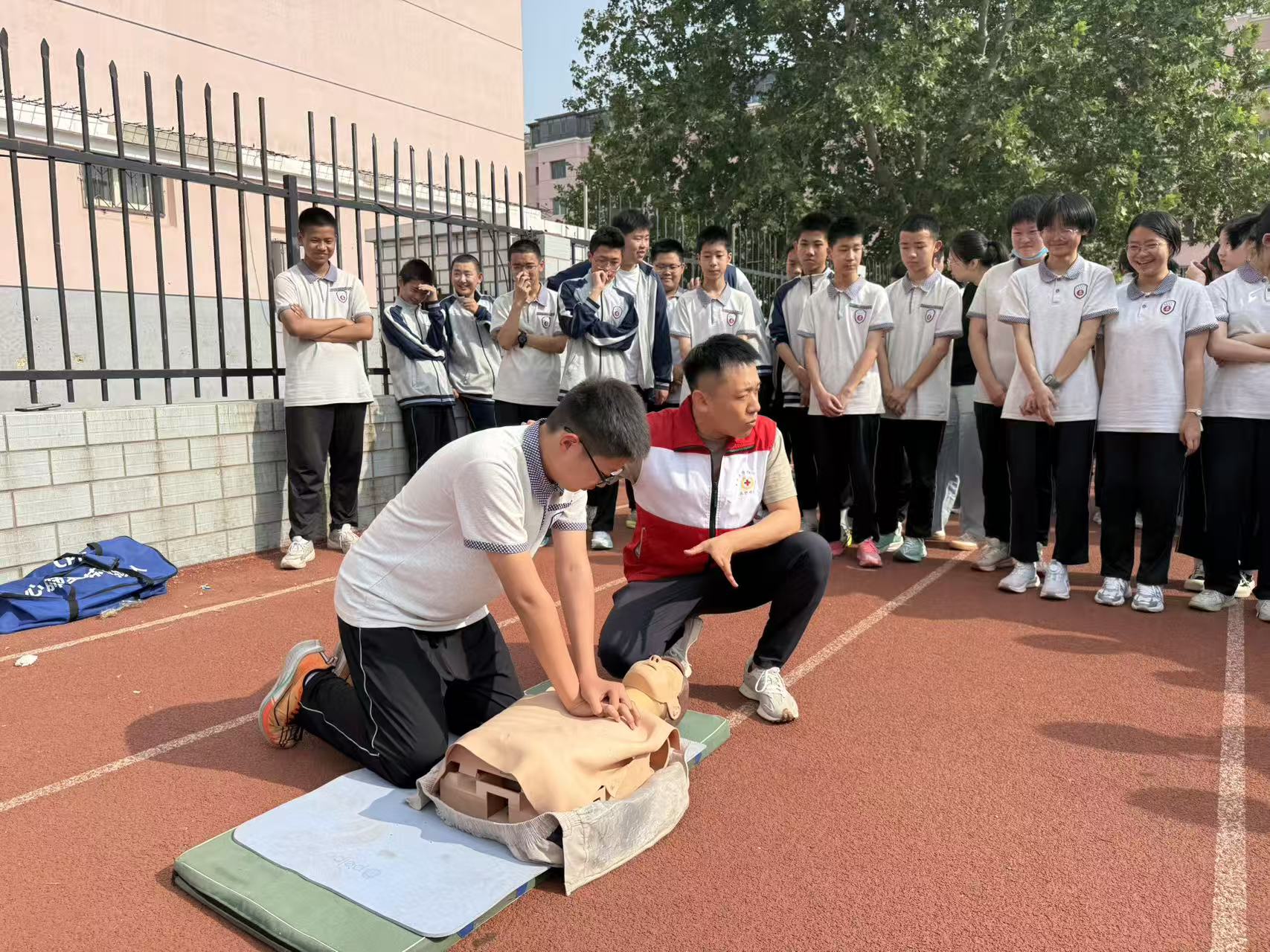 在石家庄市第二中学新生军训开展应急救护培训期间,培训中心巧妙将纪念活动与主业相结合,举办了“传承·使命”——战时救护技能回顾与现代化应急救护演练。活动不仅讲解了抗战时期战地救护的艰难与伟大,更重点展示了现代CPR(心肺复苏)、AED使用、创伤包扎、止血固定等先进救护技术,体现了对生命的尊重与守护从过去到现在一脉相承又不断发展的历程。
