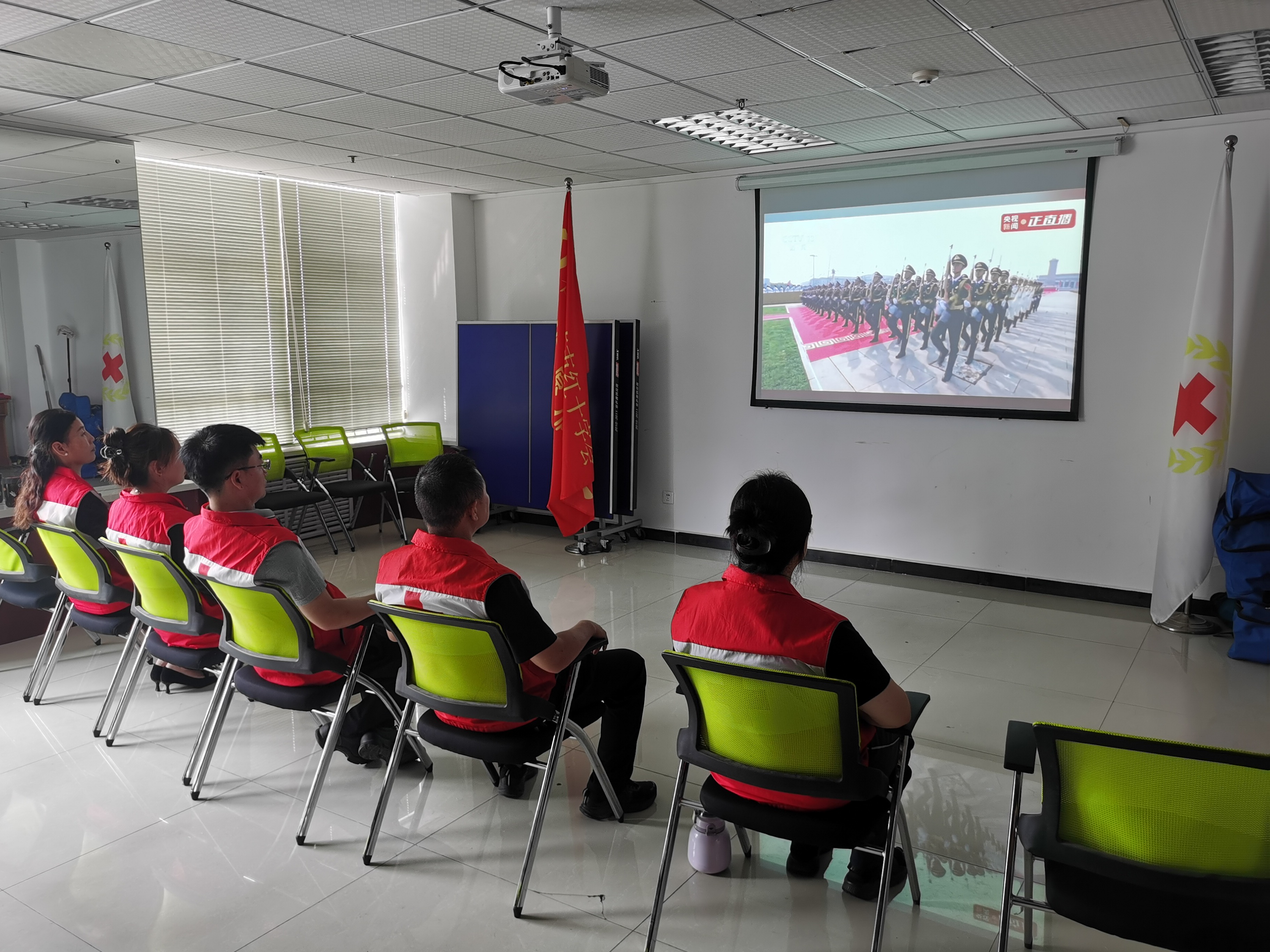 9月3日上午,培训中心组织全体工作人员集中观看了纪念中国人民抗日战争暨世界反法西斯战争胜利80周年阅兵仪式直播,随着阅兵画面的开始,全体人员起立,跟随直播画面高唱国歌。屏幕上,三军仪仗队步伐整齐、气势如虹,展示了我国国防和军队现代化建设的辉煌成就。全体人员凝神观看,眼中闪烁着自豪与敬仰的光芒。这是一次跨越80年的历史对话,也是一堂生动的爱国主义教育课。9月3日下午,培训中心召开了座谈会,回顾抗日战争期间中国红十字会及其前辈们在极其艰苦的条件下救死扶伤、开展国际援助的光辉历史,探讨如何在新时代更好地弘扬“人道、博爱、奉献”的红十字精神,提升应急救援、救护培训能力,为国家建设和人民生命安全贡献更大力量。